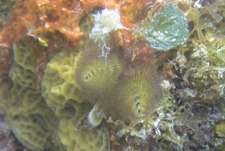Christmas tree worms in the coral head